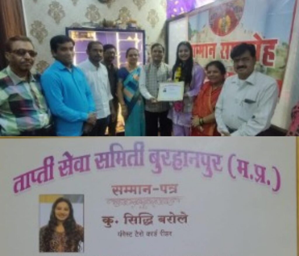 ताप्ती सेवा समिति अध्यक्ष श्रीमती सरिता भगत ने ने कु० सिद्धी सुनिल बोरले को। सम्मानित कर प्रशस्ति पत्र भेंट किया Read More »